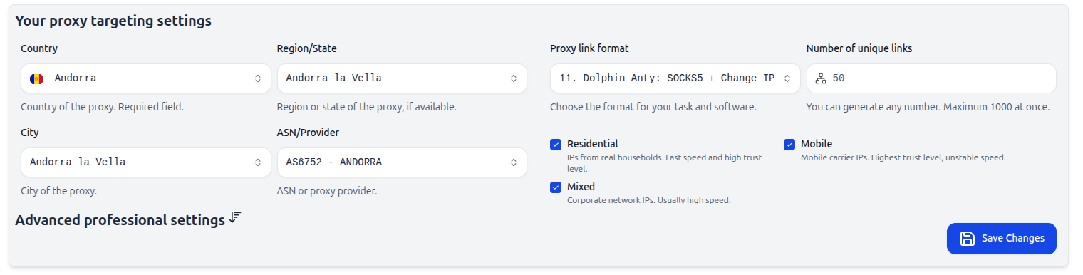Важно: Не создавайте новый прокси-сервер, если вам нужно изменить таргетинг. Вместо этого измените параметры в настройках существующего прокси.