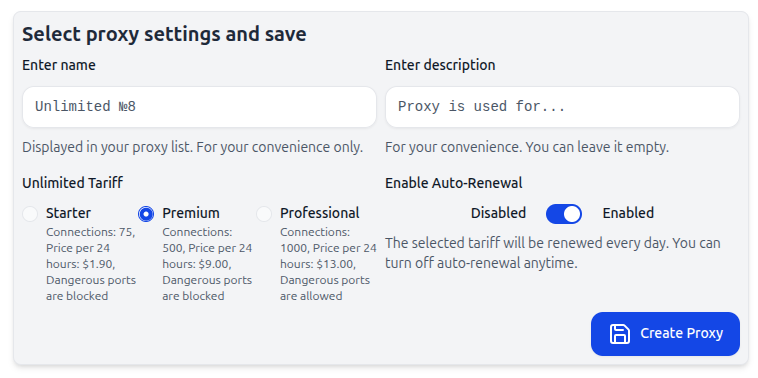 Что это: Выбор тарифа для вашего прокси-сервера. Тариф зависит от количества одновременных TCP-соединений с нашей инфраструктурой.